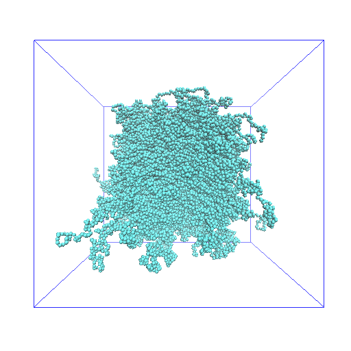 | 二元DPD粒子相分离 (3000原子), 配置文件 见example/dpd/dpd_mix.json | FENE 珠-簧模型(32000原子), 配置文件 见example/chain/chain_ext.json |