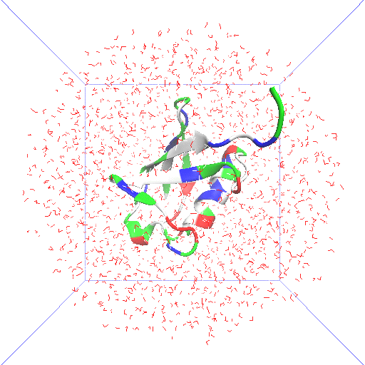 | 泛素多肽水溶液体系 (6682原子), 配置文件 见example/ubq_ws/ubq_nve.json | DPPC双层磷脂Martini模型自组织 (9600原子), 配置文件 见example/martini/DPPC/run.json |